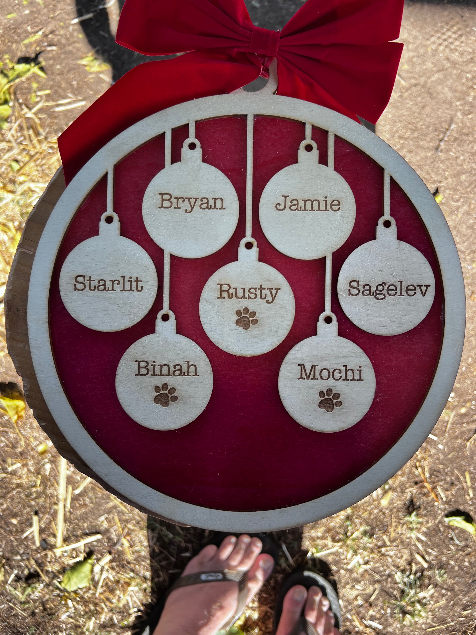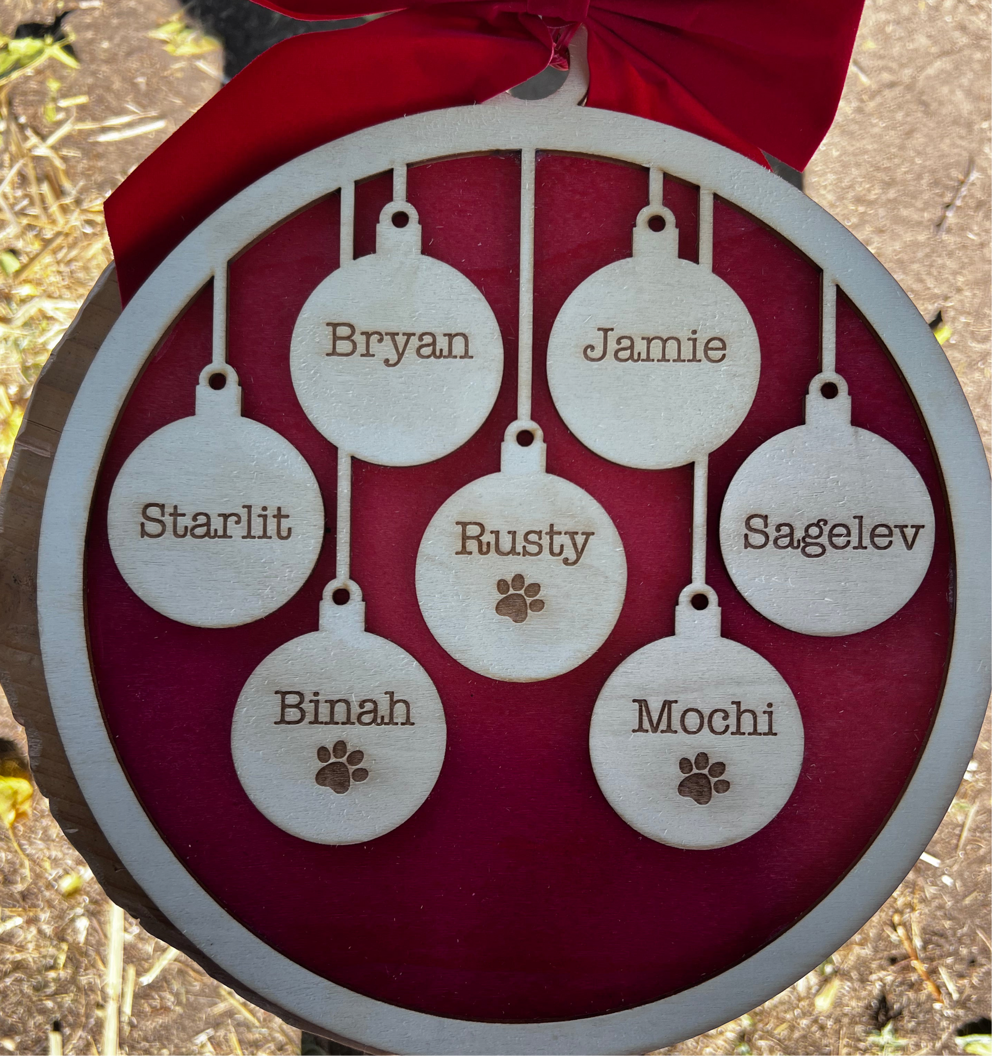 Add a personal touch to your holiday decor with our Personalized Bauble Ornament Door Hanger. Each ornament is handmade in San Diego, Ca from wood and hand painted with care. With the option to add up to 16 names, this door hanger is the perfect gift for families or a unique addition to your own home. Hang it on your front door to welcome guests or display it in your living room as a festive accent piece. Spread joy and cheer this holiday season with our Personalized Bauble Ornament Doo